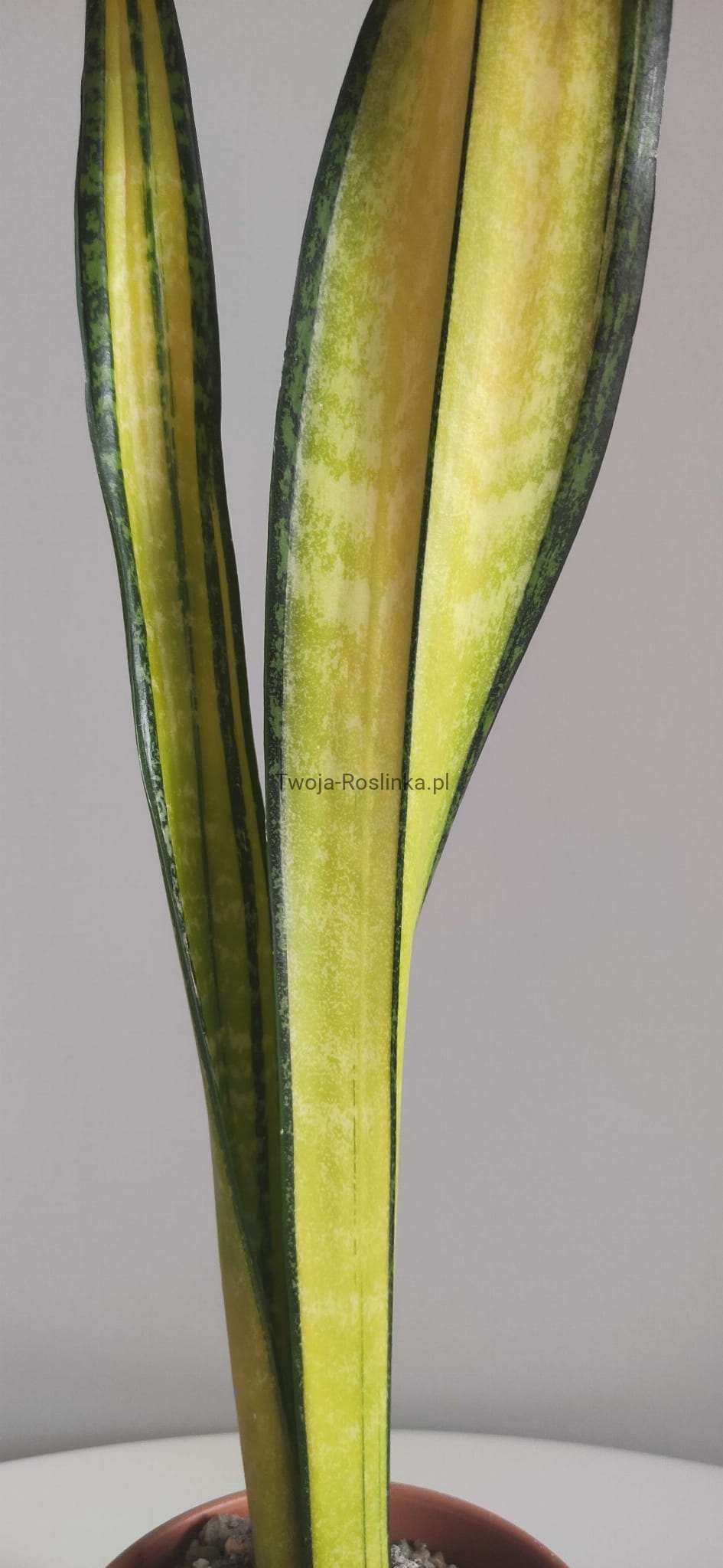 Sansevieria trifasciata ‘Forescate’ to rzadka odmiana ceniona za delikatne, żółto-zielone wybarwienie środkowej części liści. Jasne centrum kontrastuje z ciemniejszymi obrzeżami, tworząc elegancki i harmonijny efekt.