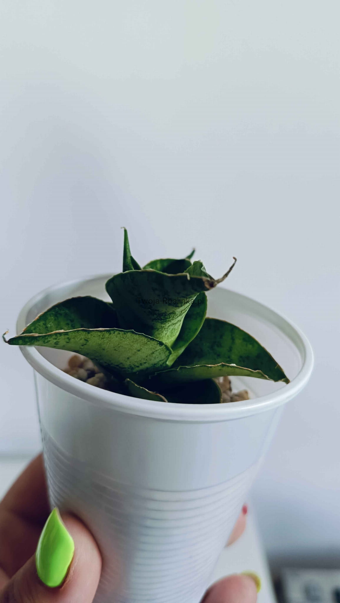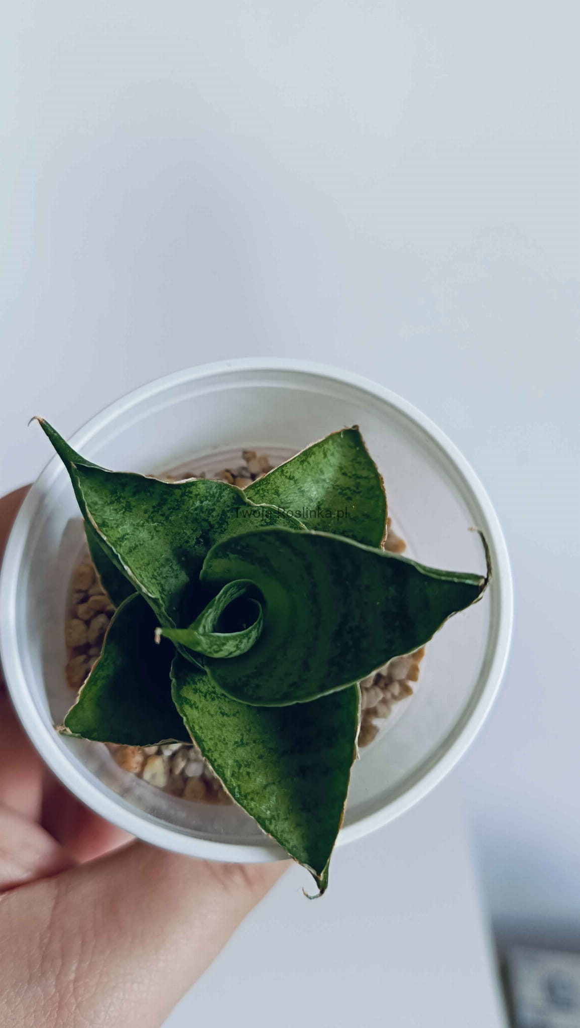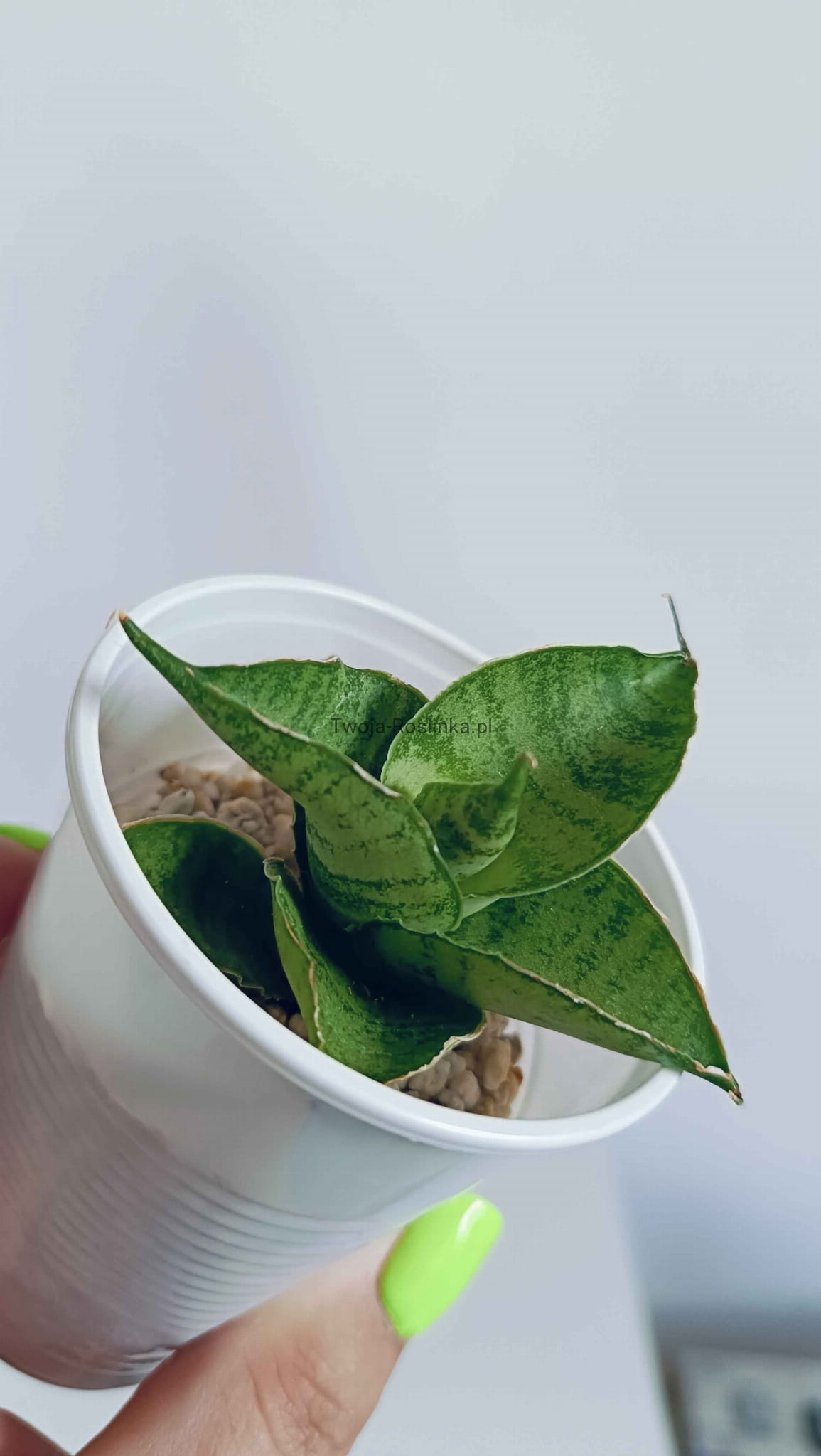 Ta ciekawa hybryda sansevierii rośnie w formie wieży. Ma bardzo żywy odcień zieleni.