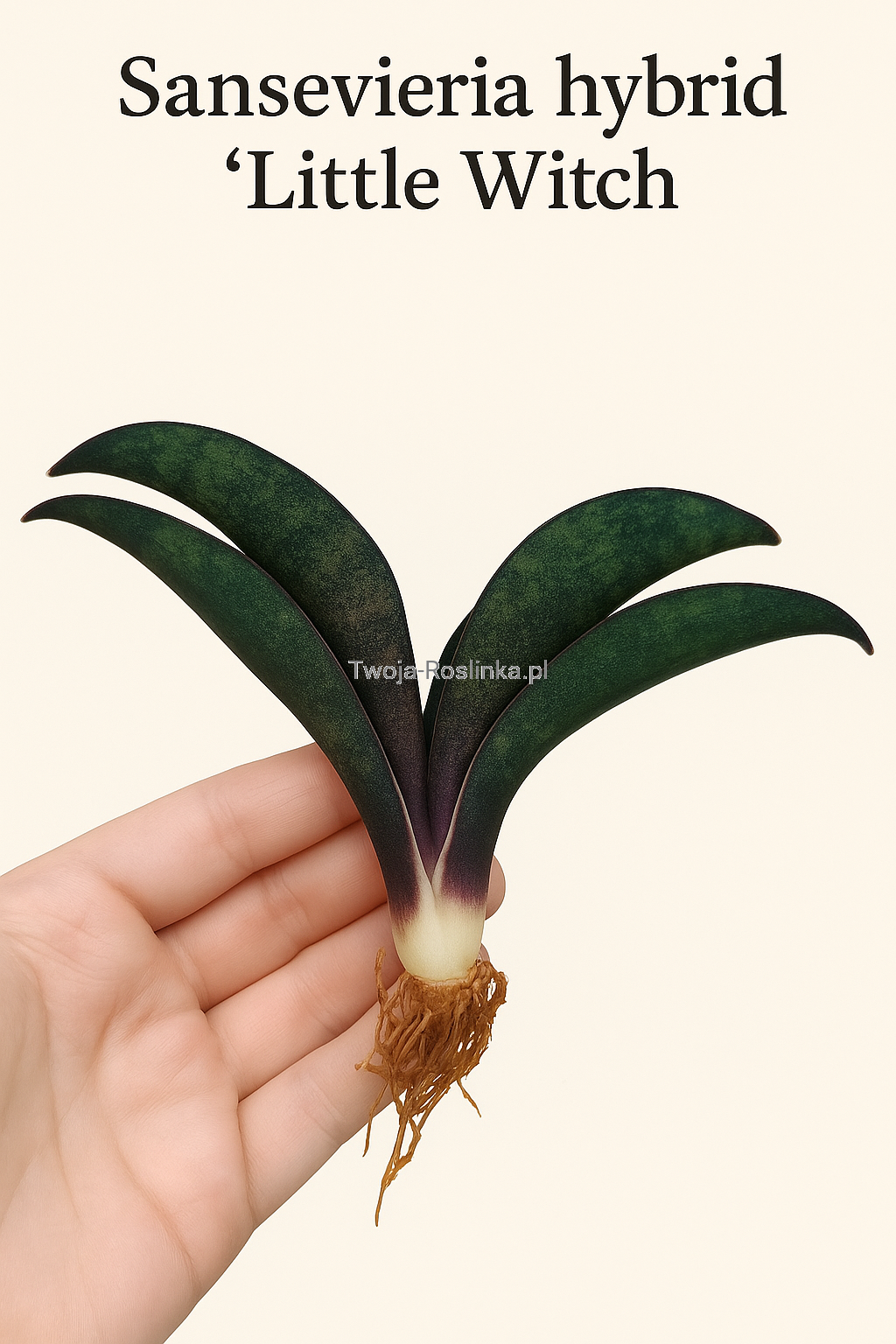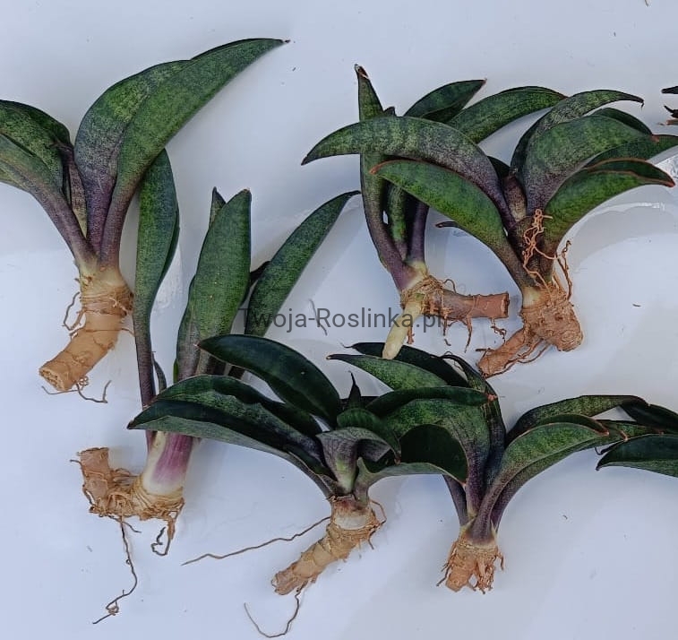 Sansevieria 'Little Witch' to urocza, kompaktowa odmiana o magicznym wyglądzie — jak na czarownicę przystało! Jej smukłe, językowate liście są grube, mięsiste i ułożone w rozetę. Barwa liści to elegancka zieleń ozdobiona fioletową nasadą.