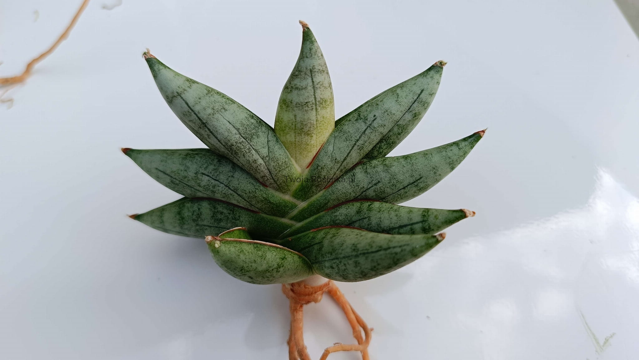 Piękna roślina pochodząca z Tajlandii. Rośnie w formie wachlarza, stąd jej rzadziej używana, potoczna nazwa "Artistic Fan". Kolorystyka spodoba się fanom Sansevierii trifasciaty 'Moonshine'. Roślina w trakcie ukorzeniania. Drobna i urocza.